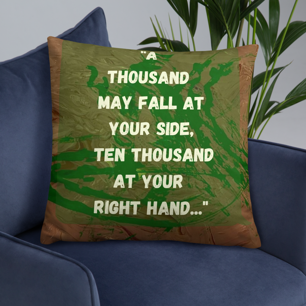 This began with my son painting the canvas, then rolling a toy car through wet paint to create the tracks that became his signature. I transformed it into a pillow and finished it with Psalm 91:7, a quiet reminder that even when life feels like a battle, we are covered. Pairs beautifully with the matching 16x20 wall print.
