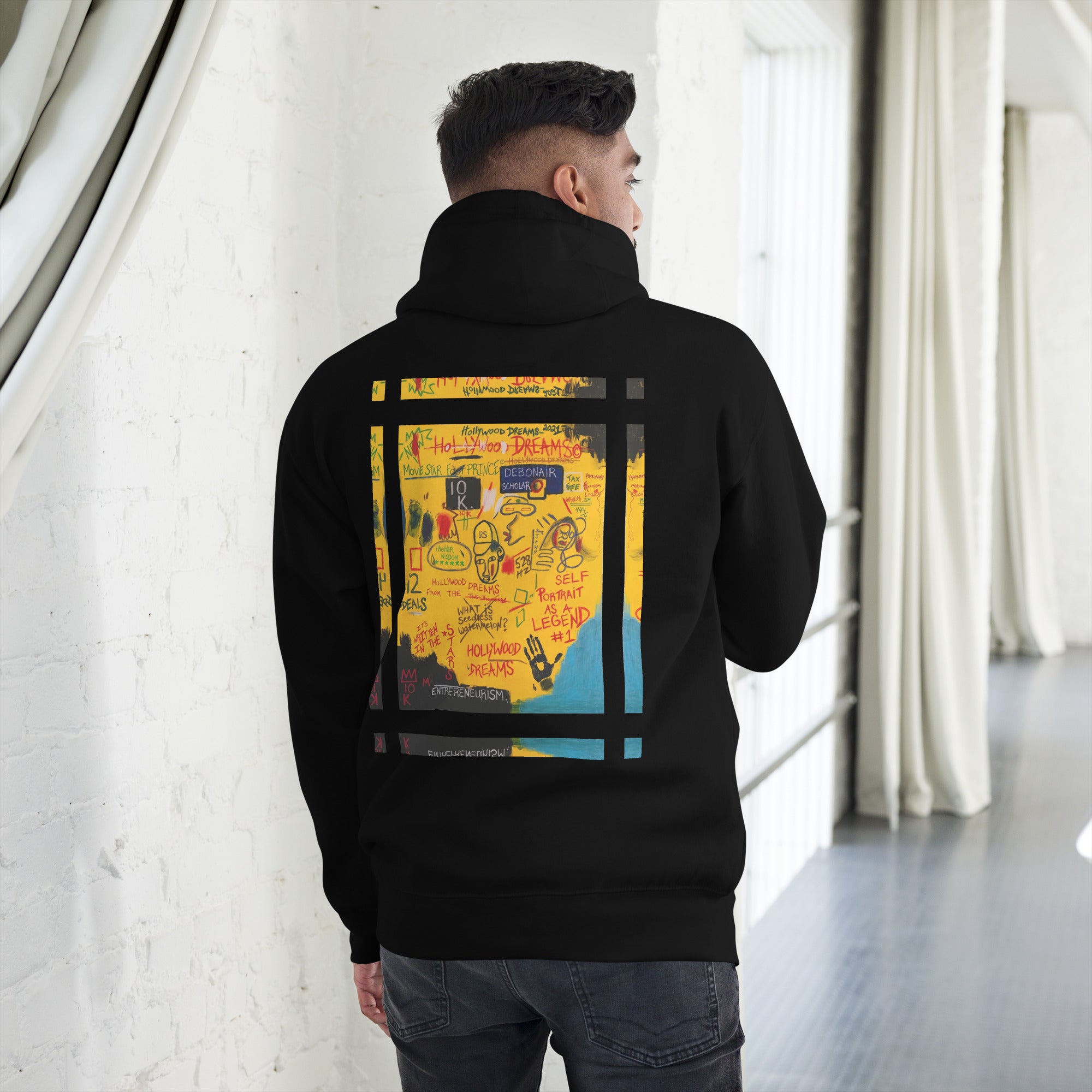 This unisex hoodie is more than fashion, it's a message. Hollywood Dreams was created as a loud reminder to believe bigger, think higher, and move like the vision is already yours. From "Higher Wisdom" to "528 Hz" to "Entrepreneurism", every symbol speaks to creativity, confidence, and purpose. Soft streetwear comfort with gallery - level energy.